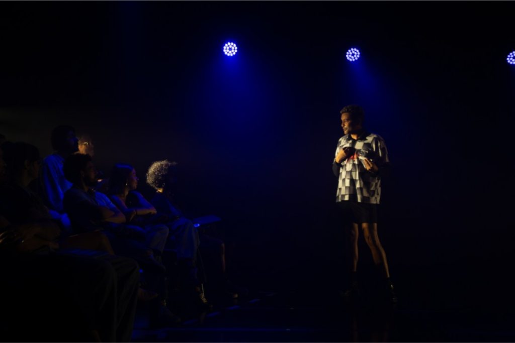 Não é fácil ser um jovem gay em São Paulo. E olha que a metrópole costuma ser um refúgio de liberdade para os saídos do armário dos mais diversos rincões do Brasil e do mundo. Mas, traumas do passado e uma instistente solidão do presente podem desastibilizar tudo. É o que a gente percebe em Aqui, Agora, Todo Mundo, tocante espetáculo solo com Felipe Barros dirigido por Heitor Garcia, com quem escreveu a dramaturgia não-linear a partir do confessional livro homônimo de Alexandre Mortagua, artista do audiovisual e da palavra que é filho do ex-jogador Edmundo, conhecido como O Animal, e da ex-modelo Cristina Mortagua, casal-sensação da década de 1990, e que carrega as dores e delícias de ser quem se é. No palco, as confissões de uma alma em ebulição ganham aguçada poética que rebate no público, presente no tablado e em jogo constante com o artista, na inventiva direção de Garcia. Não à toa, o espetáculo foi vencedor do Coelho de Prata no Festival Mix Brasil. Vemos um homem gay diante do precipício da própria existência. Barros, em uma atuação que equilibra a técnica e a entrega visceral, transforma seu corpo em um mapa de cicatrizes e desejos. O público, em um exercício de voyeurismo participativo, molda a ordem das memórias, tornando cada sessão única. Outro trunfo é a trilha eletrônica de Jaloo, com sua modernidade líquida decupada pela DJ Agatha, norteando a narrativa fragmentada, assim como a ótima luz de Rodrigo Pivetti. Em tempos de conexões efêmeras e telas que isolam, o personagem é um espelho necessário. Aqui, Agora, Todo Mundo nos recorda que a saúde mental não é um tabu hermético, mas uma construção coletiva. É teatro que cumpre sua função primordial: ser o palco no qual encaramos o abismo do outro para poder reconhecer nossas vertigens. Sobreviver é preciso.