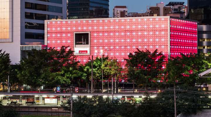 Inaugurado em 2016, com o musical We Will Rock You, o espaço no elegante Complexo JK Iguatemi em uma área construída de 8000 metros quadrados e 400 metros quadrados de palco tem um primor tecnológico, que vai desde duas 56 varas cênicas automatizadas passando pelo digital sistema de recolhimento de poltronas. Isso transforma o Teatro Santander em um camaleão cênico que recebeu dois milhões de espectadores na última década e virou casa do prestigiado Prêmio Bibi Ferreira, um dos mais importantes do mercado cênico.